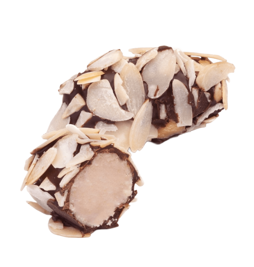• Конфета глазирована темным шоколадом и украшена бланшированными миндальными лепестками.