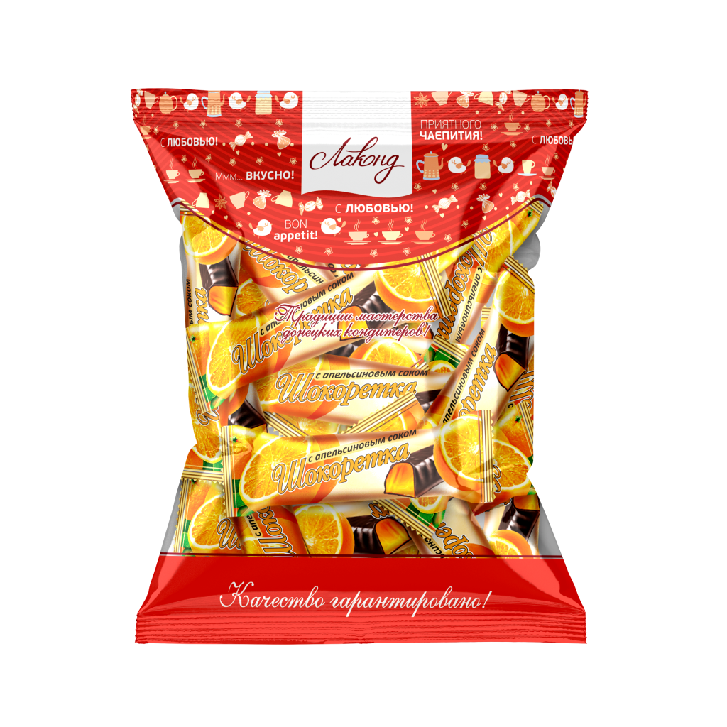 - Корпус конфеты — желе с натуральным соком апельсина.
