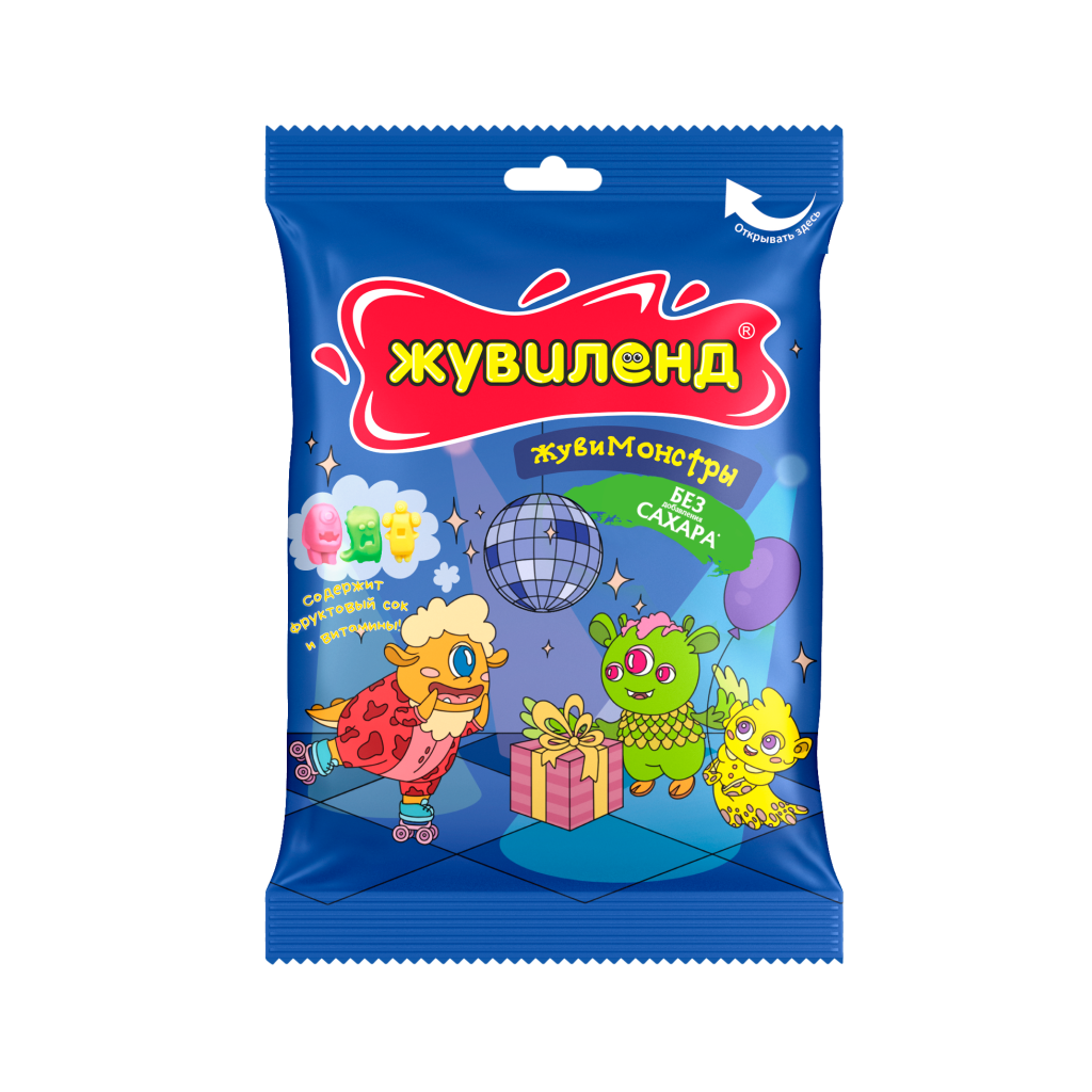 - В упаковке ассорти из вкусов: яблоко, клубника, банан, апельсин, экзотические фрукты, тутти-фрутти. Мармелад интересной формы – монстрики.