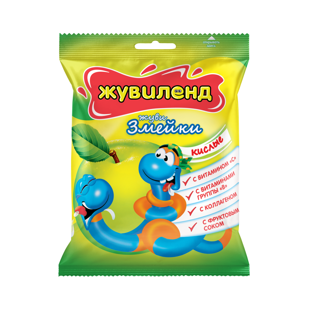 - Фруктовый желейно-жевательный мармелад, обсыпанный смесью сахара и яблочной кислоты в форме змеек.